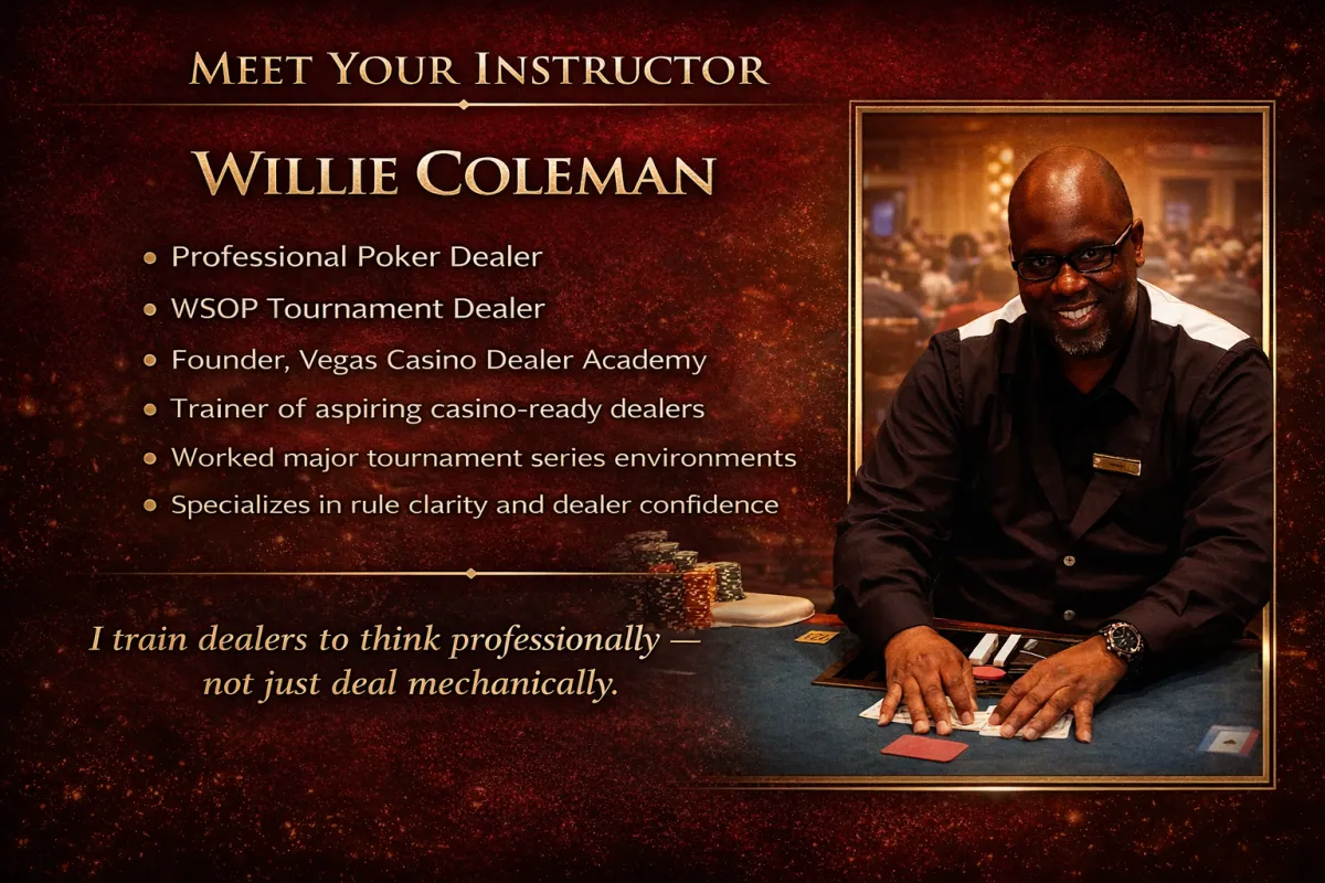 “This casino class is a very good school. Willie Coleman is a great instructor — he gets into the details, teaches mechanics, proper dealing, and official rules. Great communication skills. Highly recommend. Thank you Willie for helping me get my dealer certification.”